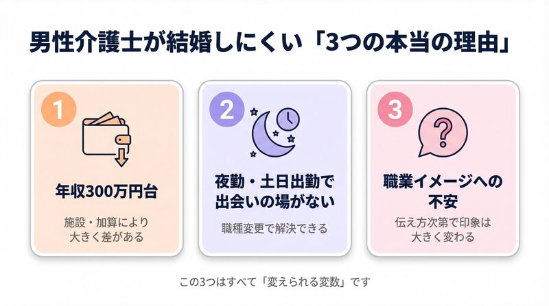 この記事では、男性介護士が抱える結婚への不安を、データと実態の両面から整理します。