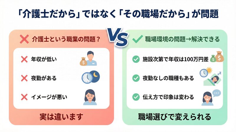 年収・勤務体系・職業イメージの3つはすべて、転職や伝え方の工夫で変えられる変数です。「介護士という職業そのものが問題」という結論には飛びつかないでください。