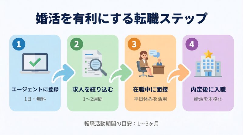 - 内定後に退職・入職(転職活動期間の目安:1〜3ヶ月):新しい職場に移ったら婚活を本格化させる
