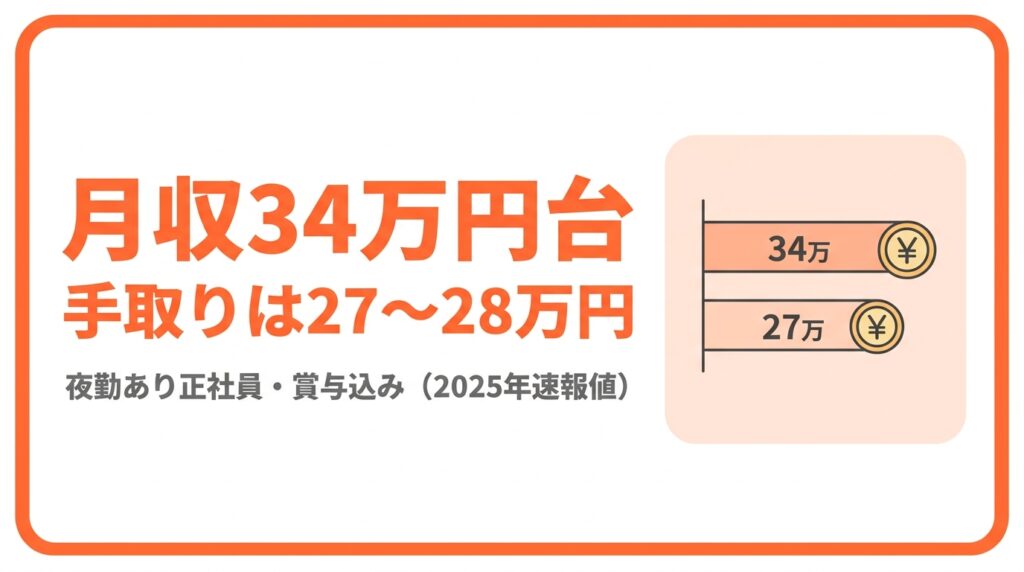 - 正社員(夜勤あり):手取り21〜26万円程度