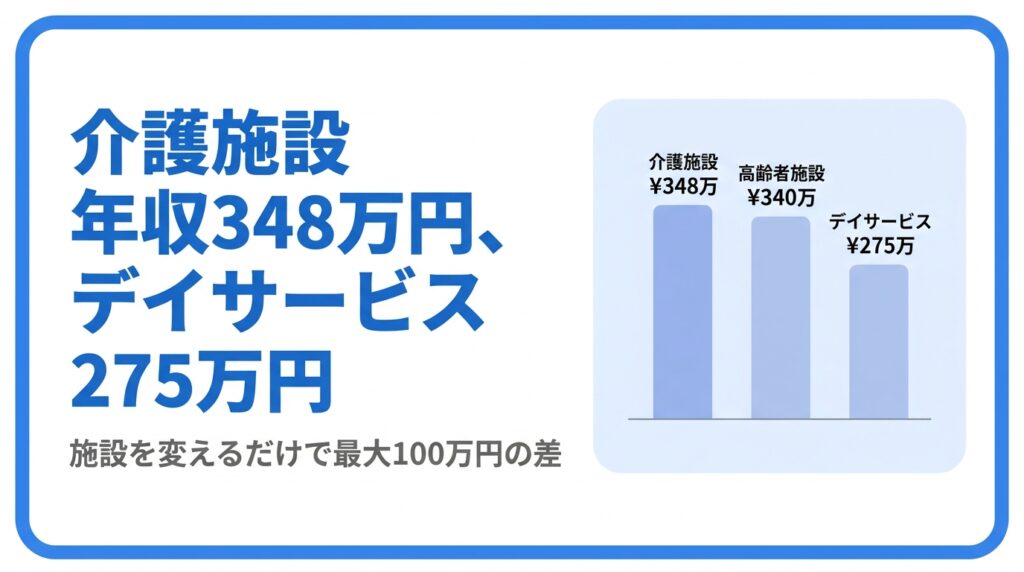 特養とデイサービスを比べると、年収差は約70〜80万円。施設によってはさらに差が広がり、100万円を超えるケースもあります。