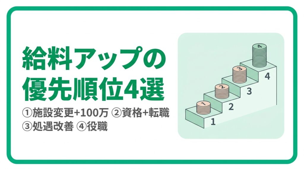 ①施設形態を変える転職(最大効果・50〜100万円)→ ②介護福祉士取得+手当のある職場へ転職(資格手当厚い職場で+30〜70万円)→ ③処遇改善加算を還元している職場への転職(+12〜36万円)→ ④夜勤専従・役職アップ(転職なしで+20〜40万円)