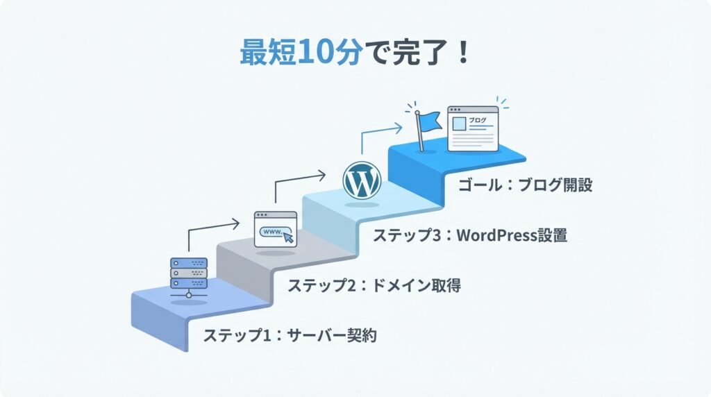 エックスサーバーの「WordPressクイックスタート」機能を使えば、面倒な設定がすべて自動化され、たった10分でブログ開設が完了します。